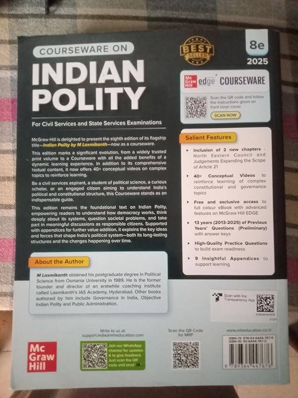 In addition to its comprehensive textual content, it now offers 3 new chapters40+ meticulously crafted conceptual videos simplifying complex concepts, 18 insightful appendicesPrevious 13 years of UPSC Preliminary Polity Questions (including 2025) with Answer Keys, Previous 12 years of UPSC Main Polity Questions and a full colour eBook.