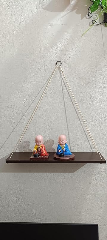 Pros:Wooden plank has a good finish and looks attractiveWorks well for keeping small decorative itemsEasy to hang on screws or nailsValue for money at this price pointCons:Rope and circle hook quality feels lower compared to the wooden plankWidth of the plank could have been more to accommodate bigger itemsRope could be thicker to give a richer and sturdier lookNo adhesive option, can only be hung with screws or nailsDetailed Review:The overall look and feel of this hanging shelf is quite attractive, and it works well for displaying light decorative articles. The wooden plank is good in quality and feels premium, but the rope and circle hook don’t quite match up to that standard. With decent weight, it holds up fine, but I feel a thicker rope and a slightly broader shelf would have added both sturdiness and better aesthetics. It doesn’t come with adhesive support, so you’ll need to hang it on a screw or a nail.Verdict:Good product for light use and decoration, especially considering the price point. Some improvements in rope and width would make it excellent.